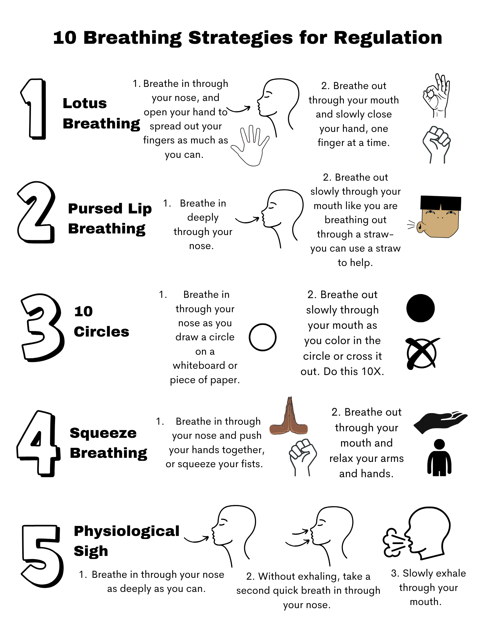 Deep breathing can be an incredible self-regulation tool, but taking deep breaths can be difficult when we are feeling anxiety or panic. This visual tool shows you 10 strategies that can help.