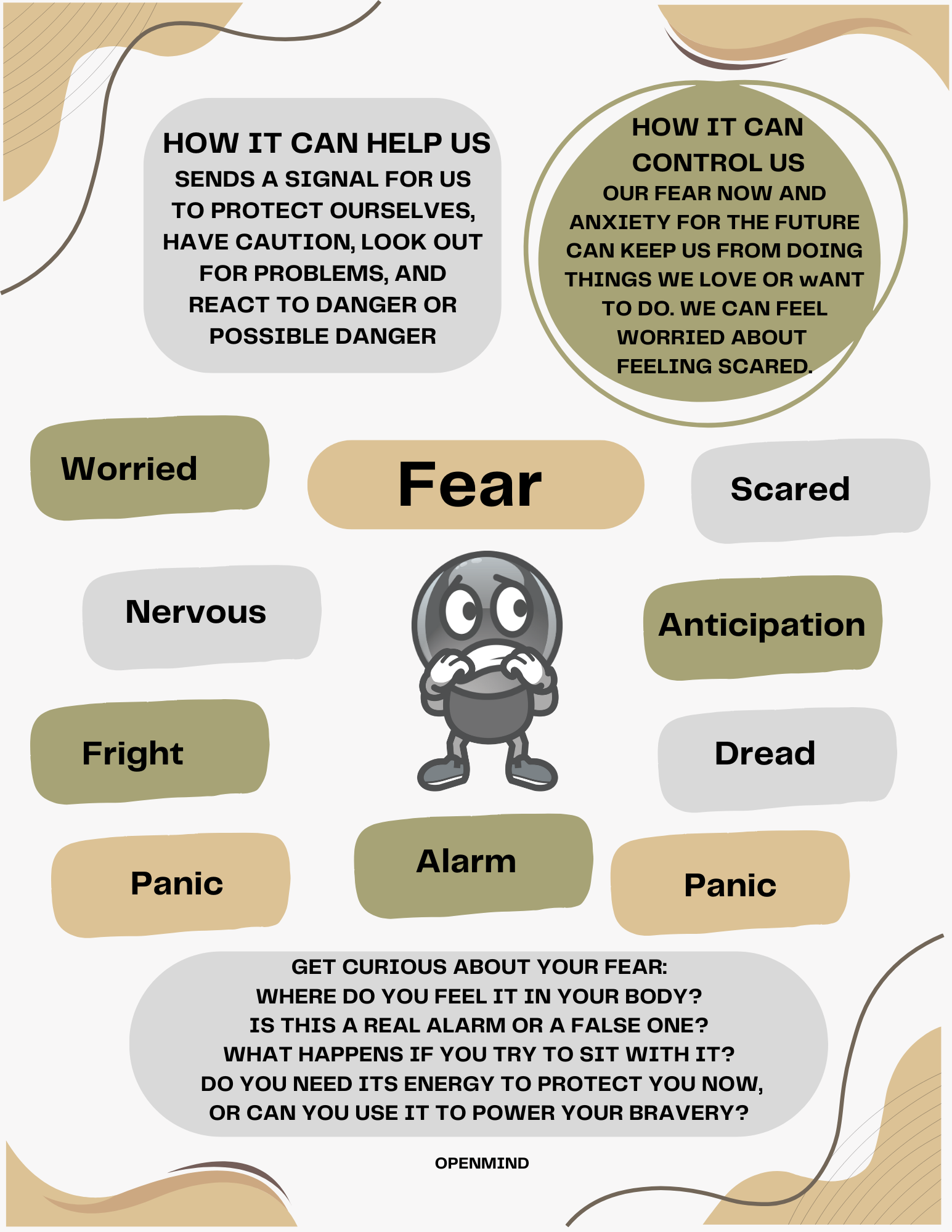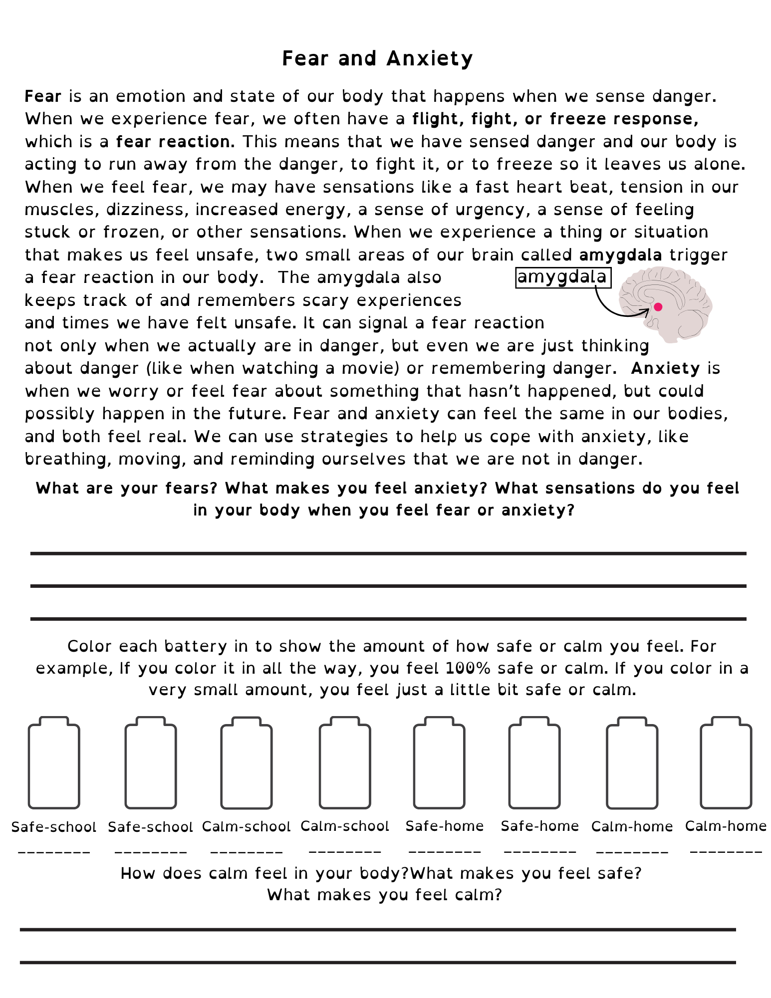This is a lesson and exercise to help kids begin to learn about the fear response and the area of the brain that triggers it, to understand the relationship between fear and anxiety, to explore the body sensations we feel with fear, and to try some focused breathing strategies to help ease anxiety. You can use the body sensations cards to help kids to identify somatic feelings associated with anxiety, fear and calm.