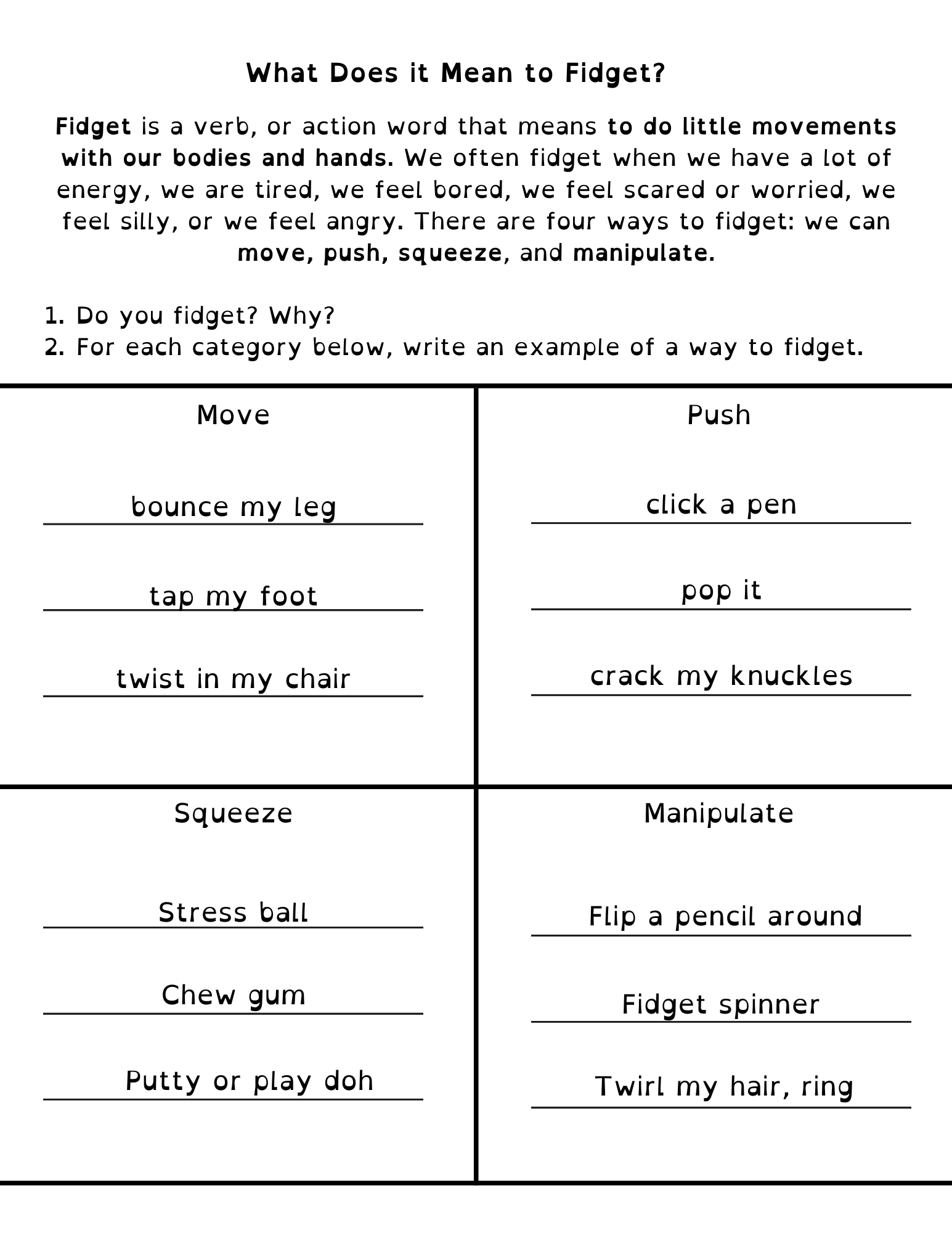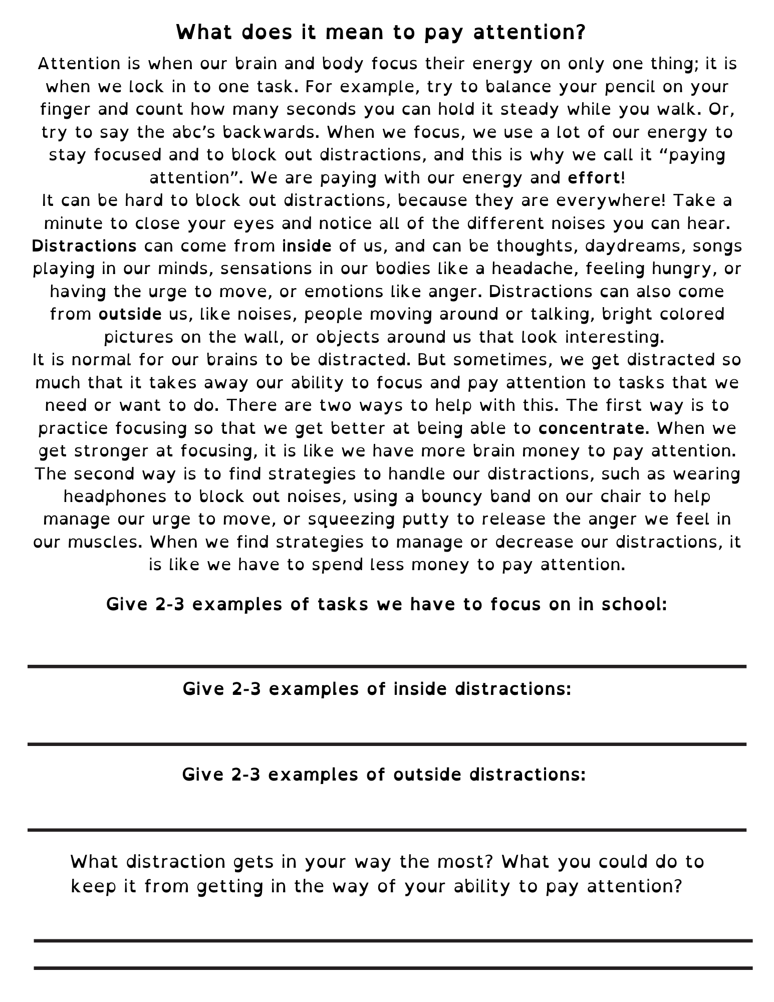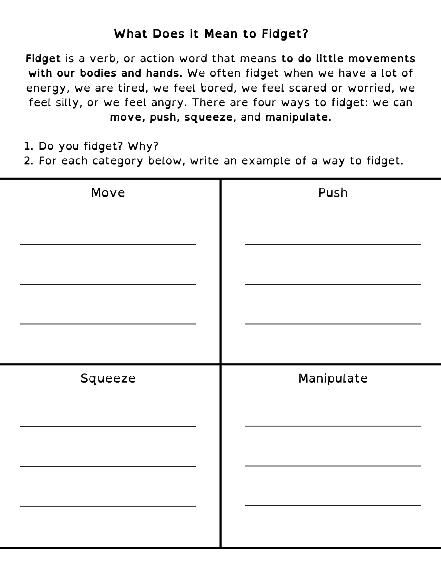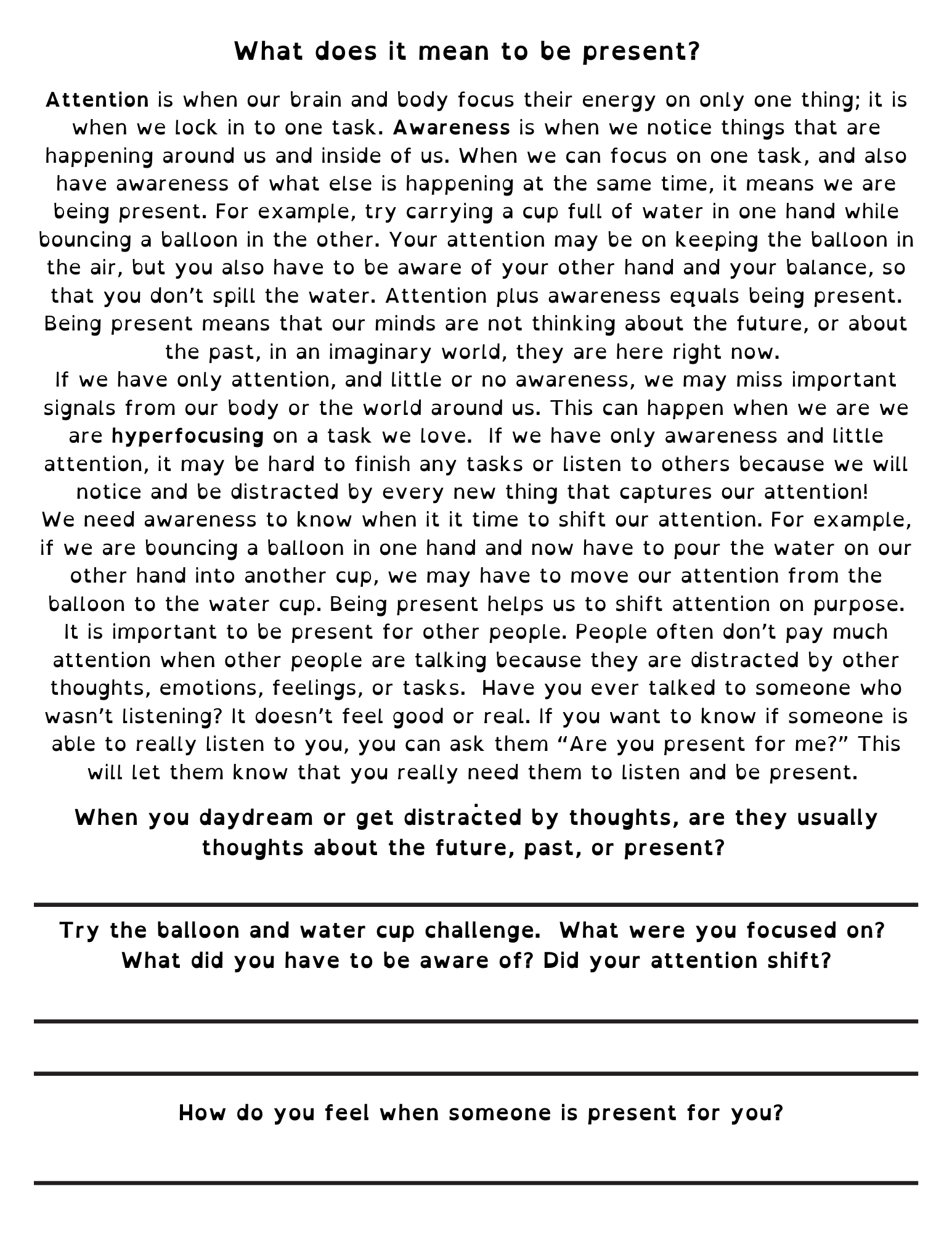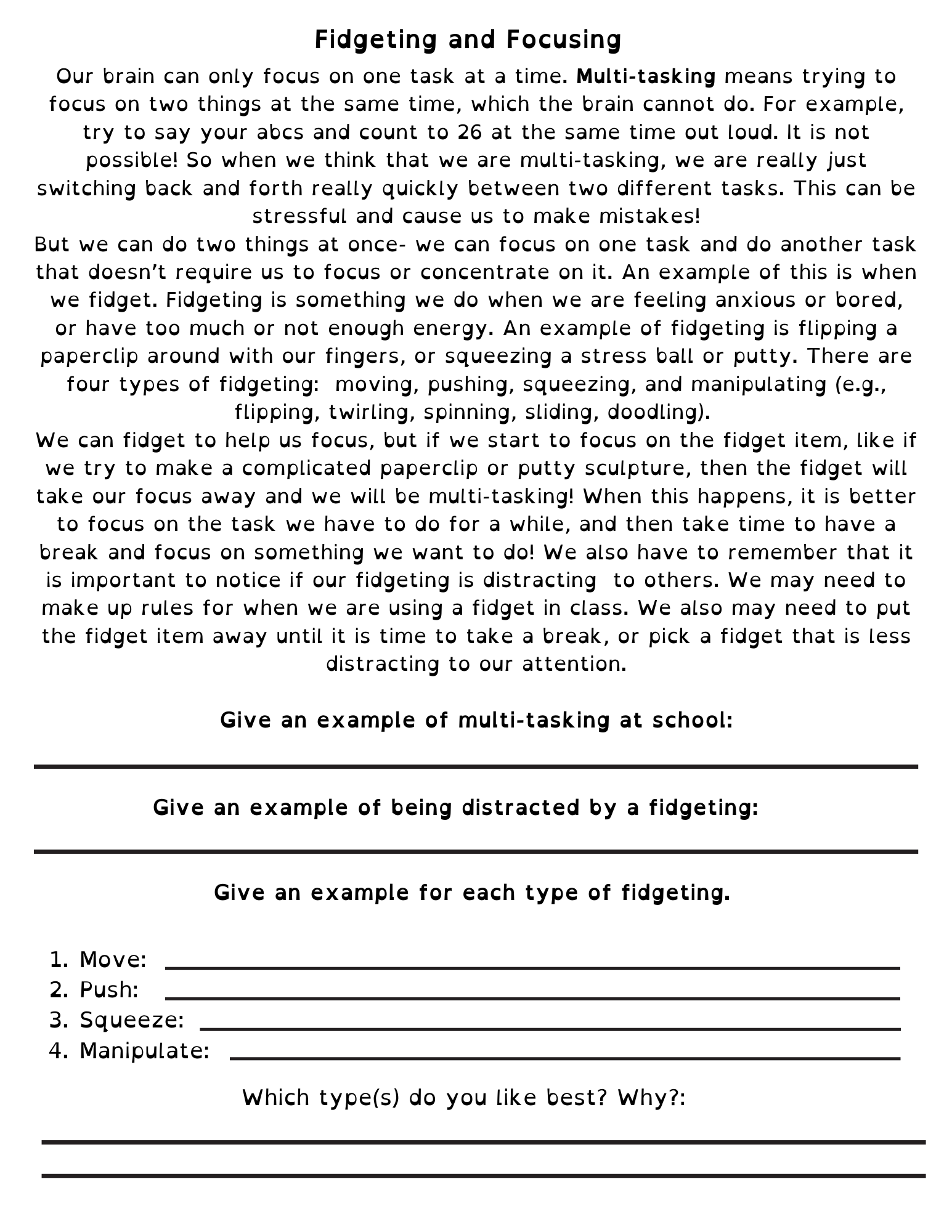 These lessons help teach kids what it means and how it feels to pay attention, to be aware, and to be present. It also teaches about different aspects of fidgeting, and how they can use fidgeting and movement to help to improve focus, engagement and regulation.