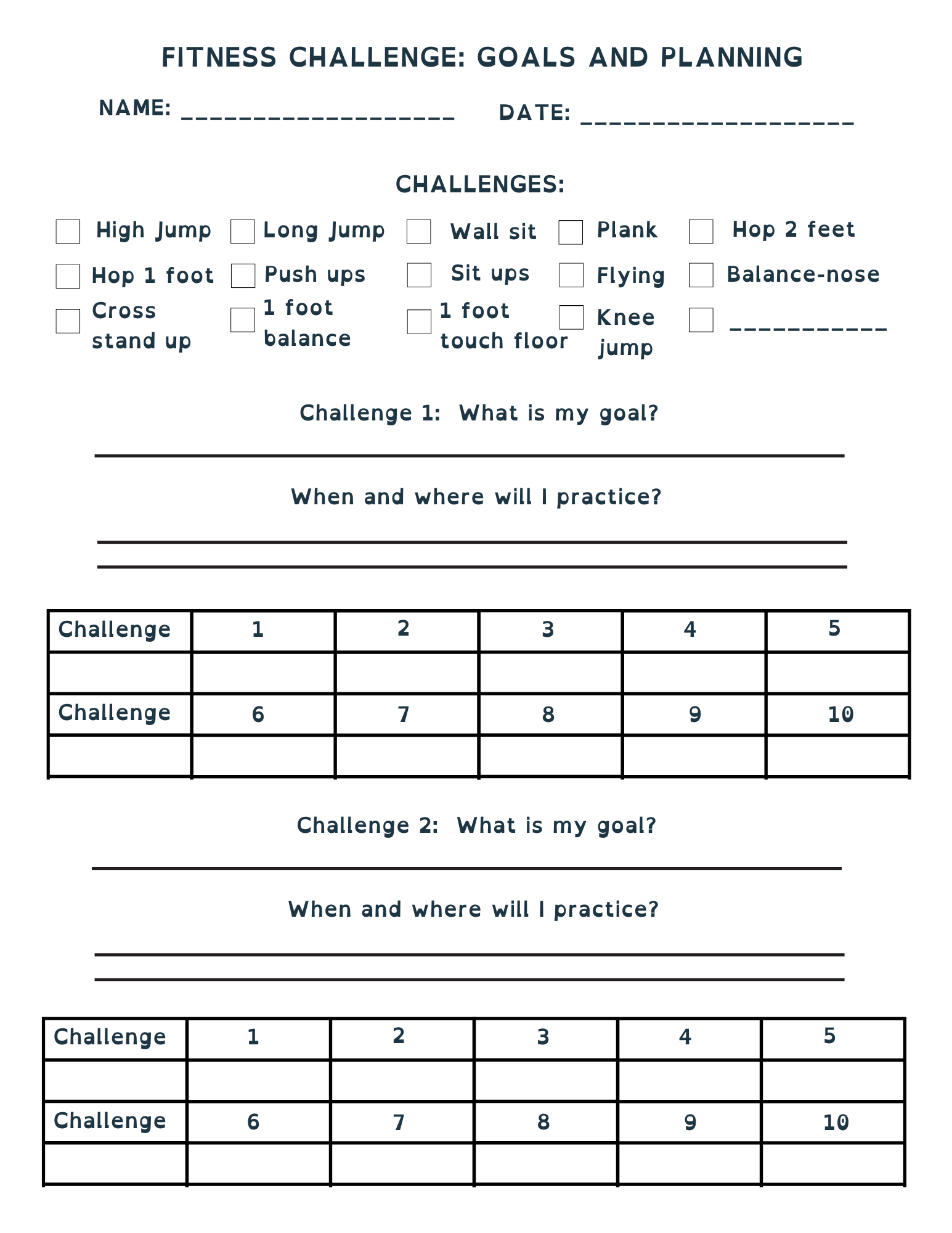 Physical activity has been associated with psychological wellbeing and cognitive performance, and gross motor skills have been associated with executive functioning skills. This is a tool that can help kids identify a challenge goal and track their progress.