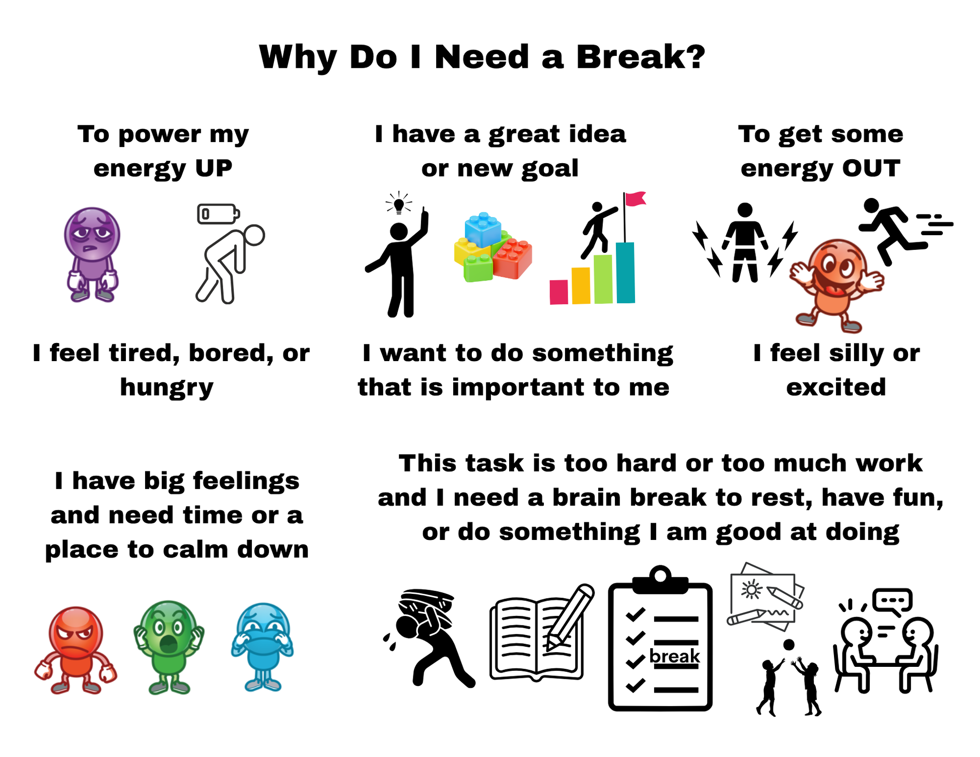 This is a planning tool to help kids gain awareness, set limits, chunk tasks, and strategically use movement and play as regulating input in the form of breaks. It can also help them understand why they may be needing a break, learn to regulate unchecked screen time and boost regulation and motivation for homework or other tasks that they may dread or avoid doing.